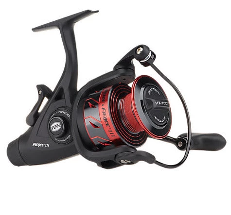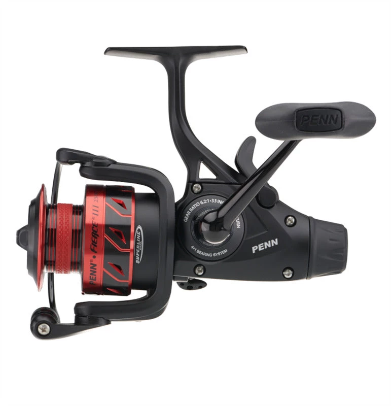 The PENN® Fierce® III spinning reels are available in a range of sizes, from 2500 to 8000. Featuring a full metal body and sideplate, along with PENN HT-100™ carbon fiber drag washers, the Fierce III can handle anything inshore or nearshore. A 4+1 shielded stainless steel ball bearing system ensures smooth retrieves while the heavy-duty aluminum bail wire and superline spool allow for easy line management. The innovative Live Liner drag system is adjustable and automatically disengages with a turn of the handle, making it ideal for bait fishing.