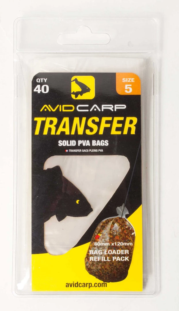 Theย Avid Carp Transfer Solid PVA Bags are sold in packs of 40, their tough design makes them very popular for anglers who need a tough bag which will survive the hardest of casts.