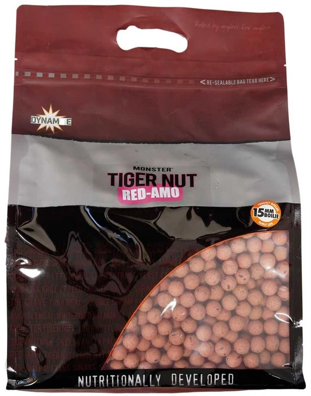 Dynamite Monster Tiger Nut Red-Amo Boilies were born from a plan first hatched in early 2013. Dynamite took possession of a new fruit based feed inducing palatant that, when test, produced an almost unbelievable reaction from the test fish. Test mixes of bait were rolled using this original fruit palatant, but when mixed with Monster Tiger Nut recipe, Dynamite knew they had something that really was unique! It smelt out of this world!!