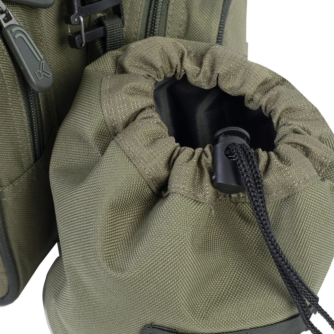 The side of the bag features a handy gas canister holder, which attaches using Korum’s unique Transition clip design. What’s more, you can add the separately available Transition Cool Pouch to the top of the bag, securing it with the carry handles. The bag is also compatible with ITM and Transition tackle boxes and pouches as well as D loop attachments and two carabiners or unhooking mats.