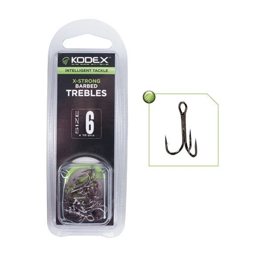 X-Strong trebles hooks from Kodex are produced from high tensile strength 110 carbon, which means they will not easily straighten out. The points are very sharp to give maximum penetration, while the welds on the treble construction are super secure. They are finished in black chrome that slightly flashes like the skin tones of a silverfish, making the hooks themselves an attractant!