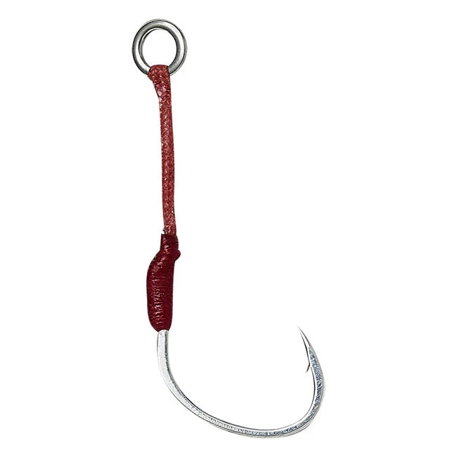 Our Single assist hook range is specially designed to fit perfectly our needle jig and Slim Jig minnow. The super strong and light weight hooks are tied to blood red hollow Fluoro Carbon core PE Braid. The Shape of our Hooks match perfectly the body shape of the most common jigs and the unique Looped rigging gives a superb hook up rate. We have wrapped tied the core all the way to the end of the spade of the hooks, so the hooks move freely and donโt tangle or scratch the jig! Super sharp forged hooks made from Japanese XC75 Carbon Steel and epoxy coated wrappings. Suggested use: Bloody Single assist hooks have medium length cord and are ideal for rigging semi long and long jigs from one side, adding one or two in the split ring. They are suggested for Light jigging, Shore Jigging, Cast Jigging and Vertical Jigging techniques.