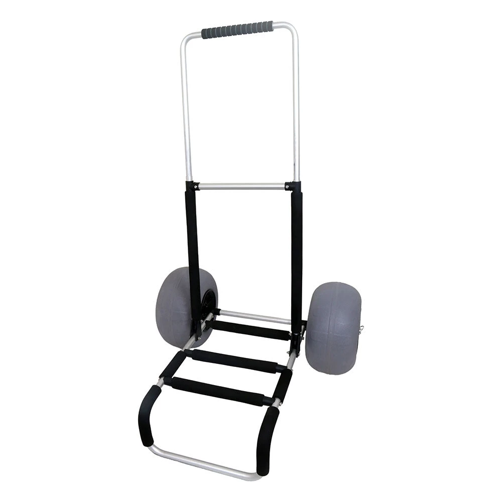The large, 18cm pneumatic wheels make this a go to anywhere loading trolley. Pneumatic wheels are more efficient at spreading the load of the trolley weight, so it can be used over sand, shingle, small rocks, piers and breakwaters. Designed to take the strain out of any long walk to a fishing mark and for boat anglers, who are taking a large amount of kit to and from the boat.