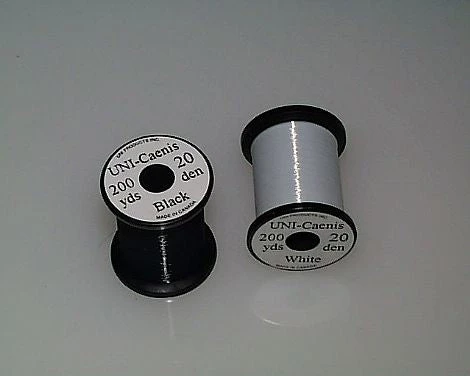 UNI introduces the smallest fly tying thread ever. Spooled on bobbins of 200 yards. Black and White. Single ply construction.