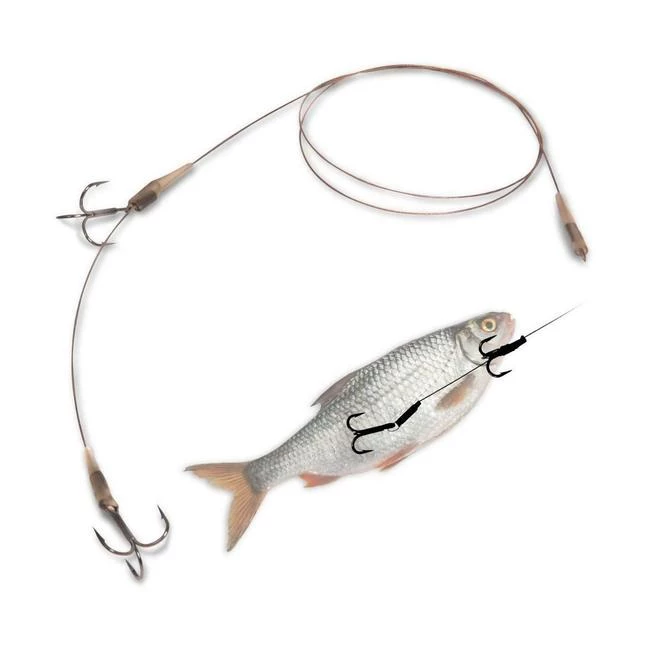 Mr. Pike Universal Leader – ready-made rigs for float fishing and legering, equipped with high-quality carbon steel hooks tied onto 30 lb (14 kg) inconspicuous camo steel leader. High-quality production is of the utmost priority with each pinch sleeve connection being made individually by hand and inspected.
